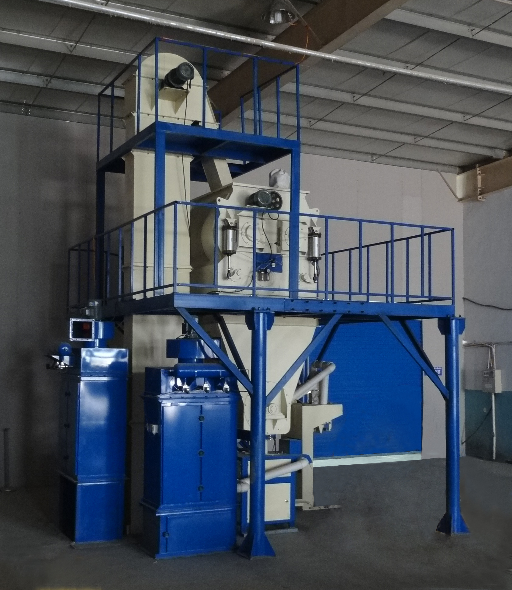 3、首先開啟斗式提升機、空氣壓縮機和除塵器,啟動配料稱斗開始工作,并將配好的物料由斗提提至待混倉。
